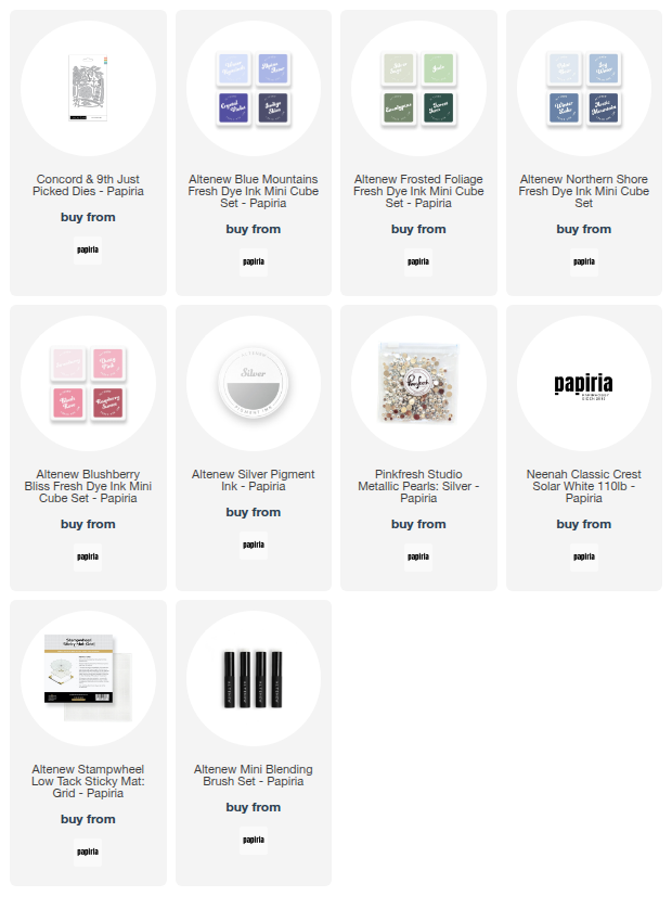 På de to største blomstene brukte jeg Icy Water, Winter Lake og Arctic Mountain (Northern Shore-settet), på den lille Blue Mountains-settet og på bladene Frosted Foliage-settet. For å adde litt shine og "kulde" brukte jeg sølv pigmentblekk fra Altenew.