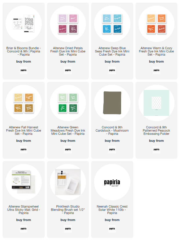 Blekkfargene jeg brukte var først Acai Berry på selve bunnkransen, Berrylicious på de største blomstene, begge disse fra Dried Petals. Så brukte jeg Turquoise fra Deep Blue Seas på de litt mindre og til slutt Sunkissed fra Warm & Cozy. På bladene brukte jeg Mountain Pine fra Green Meadows. Alle blekkene er fra Altenew.